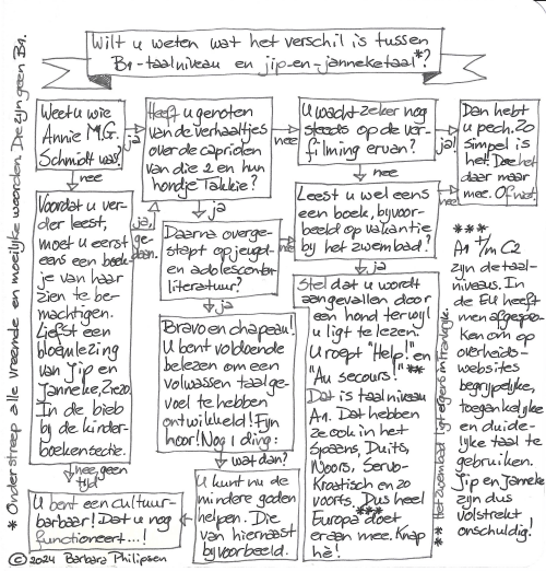 Niet alleen was ik zelf heel tevreden, de eerste beslisboom werkte ook op de lachspieren van mijn collega’s. Een tweede en een derde volgden. Inmiddels heb ik al meerdere beslisbomen getekend en de laatste is voorlopig nog niet in zicht. Een aanvulling op mijn identiteit!